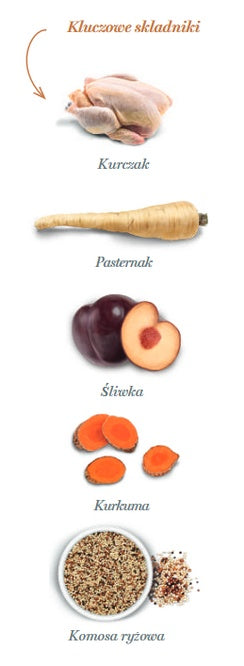 świeżo przygotowany kurczak 60% (używamy 100 kg świeżo przygotowanego kurczaka do wyprodukowania 100 kg naszego produktu), białko grochu, białko ryżu, białko ziemniaka, lignoceluloza, cały zielony groszek, drożdże  (Saccharomyces cerevisiae), brązowy ryż, hydrolizat wątroby kurczaka, błonnik jabłkowy, minerały, tapioka, nasiona lnu (naturalne źródło kwasów tłuszczowych omega 3), słód jęczmienny w proszku, psyllium, kryl antarktyczny, odwodniona dynia, odwodniony jarmuż, wodorosty, spirulina, komosa ryżowa 1 000 mg/kg, odwodniona marchew 1 000 mg/kg, cykoria (źródło FOS) 1 000 mg/kg, hydrolizowana ściana komórkowa drożdży (źródło MOS) 1 000 mg/kg, ekstrakt z  mandarynki, imbir, odwodniona pomarańcza 500 mg/kg, mięta 500 mg/kg, rozmaryn, yucca schidigera.