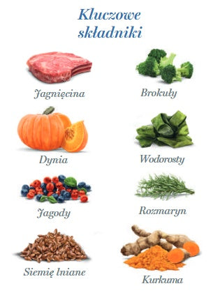 jagnięcina 85% (w tym 60% świeża jagnięcina, 25% bulion jagnięcy), dynia 5%, białko ziemniaczane, ziemniaki 2%, żurawina, minerały, olej słonecznikowy, siemię lniane 0,03%, inulina (źródło FOS) 0,02%, hydrolizowana ściana komórkowa drożdży (źródło MOS) 0,02%, chondroityna 200 mg/kg, brokuły 100 mg/kg, wodorosty morskie 100 mg/kg, rozmaryn 100 mg/kg, kurkuma 100 mg/kg