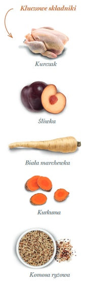 świeżo przygotowany kurczak 68% (używamy 135 kg świeżo przygotowanego kurczaka do wyprodukowania 100 kg naszego produktu), brązowy ryż, cały zielony groszek, błonnik jabłkowy, hydrolizat wątroby kurczaka, drożdże (Saccharomyces cerevisiae), minerały, nasiona lnu (naturalne źródło kwasów tłuszczowych ω3), olej rybny (chroniony naturalnymi tokoferolami), białko ziemniaczane, glukozamina 1,400 mg/kg, odwodniona dynia, odwodnione brokuły, odwodniony jarmuż, kryl antarktyczny, wodorosty kelp, żurawina, spirulina, komosa ryżowa 1,000 mg/kg, biała marchew 1,000 mg/kg, odwodnione śliwki 1, 000 mg/kg, cykoria (źródło FOS) 1,000 mg/kg, hydrolizowana ściana komórkowa drożdży (źródło MOS) 1,000 mg/kg, chondroityna 1,000 mg/kg, imbir, rozmaryn, kurkuma 1,000 mg/kg, Yucca schidigera.