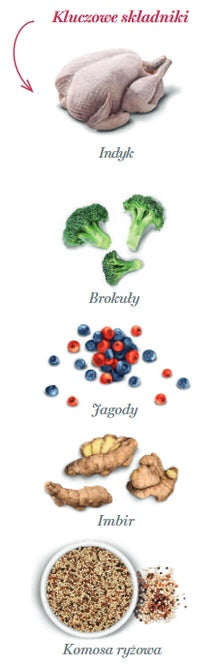 Świeżo przygotowany indyk 45% (używamy 67 kg świeżo przygotowanego indyka do wytworzenia100 kg naszego produktu), cały zielony groszek, białko ziemniaczane, białko grochu, brązowy ryż, lignoceluloza, drożdże (Saccharomyces cerevisiae), hydrolizat wątroby indyka, tapioka, minerały, błonnik jabłkowy, cały jęczmien, nasiona lnu (naturalne źródło kwasów tłuszczowych omega 3), cały owies, maczka chleba świętojańskiego, olej rybny (chroniony naturalnymi tokoferolami), glukozamina 1,400 mg/kg, odwodniona dynia, odwodniony jarmuż, kryl antarktyczny, wodorosty kelp, spirulina, cykoria (źródło FOS) 1,000 mg/kg, komosa ryżowa 1,000 mg/kg, odwodnione brokuły 1, 1,000 mg/kg, żurawina 1,000 mg/kg, jagody 1,000 mg/kg, imbir 1,000 mg/kg, chondroityna 1,000 mg/kg, hydrolizowana ściana komórkowa drożdży (źródło MOS) 1,000 mg/kg, rozmaryn, Yucca schidigera