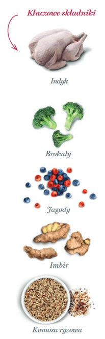 Świeżo przygotowany indyk 45% (używamy 67 kg świeżo przygotowanego indyka do wytworzenia 100 kg naszego produktu), cały zielony groszek, białko ziemniaczane, białko grochu, brązowy ryż, tapioka, maczka chleba świętojańskiego, lignoceluloza, drożdże (Saccharomyces cerevisiae), hydrolizat wątroby indyka, minerały, błonnik jabłkowy, cały jęczmień, nasiona lnu (naturalne źródło kwasów tłuszczowych omega 3), cały owies, olej rybny (chroniony naturalnymi tokoferolami), glukozamina 1,400 mg/kg, odwodniona dynia, odwodniony jarmuż, kryl antarktyczny, wodorosty kelp, spirulina, cykoria (źródło FOS) 1,000 mg/kg, komosa ryżowa 1,000 mg/kg, odwodnione brokuły 1,000 mg/kg, żurawina 1,000 mg/kg, jagody 1,000 mg/kg, imbir 1,000 mg/kg, chondroityna 1,000 mg/kg, hydrolizowana ściana komórkowa drożdży (źródło MOS) 1,000 mg/kg, rozmaryn, yucca schidigera.