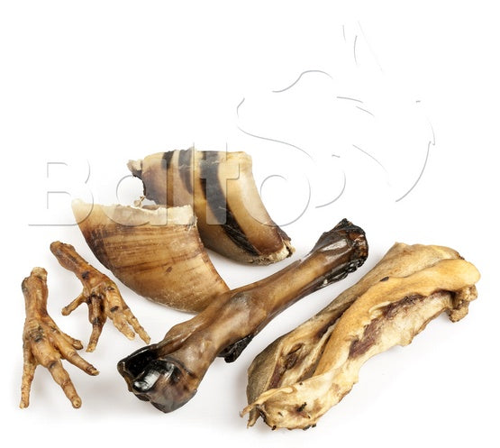 Mając na uwadze portfele właścicieli psów, zebraliśmy w zestawie funkcjonalne gryzaki o stosunkowo niskiej cenie: stripsy wołowe (skóra z głowy wołowej-twarda i nieregularna), kopyta wołowe (można je faszerować jak konga), kurze łapki, racice dzika lub sarny - czyli dla każdego coś miłego.