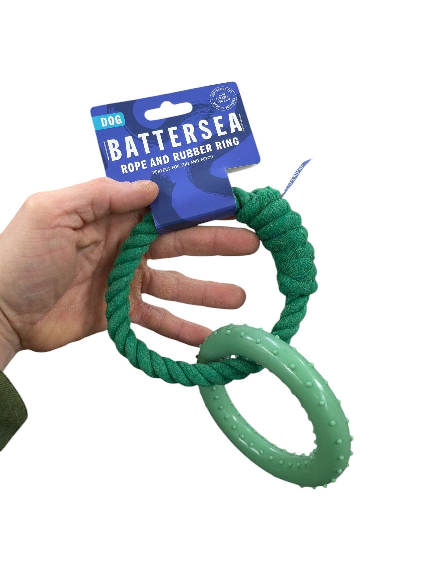 The Battersea Ring Rubber/Rope Green is ideal for dogs who enjoy interactive games and light chewing activities. Suitable for small to medium-sized dogs.