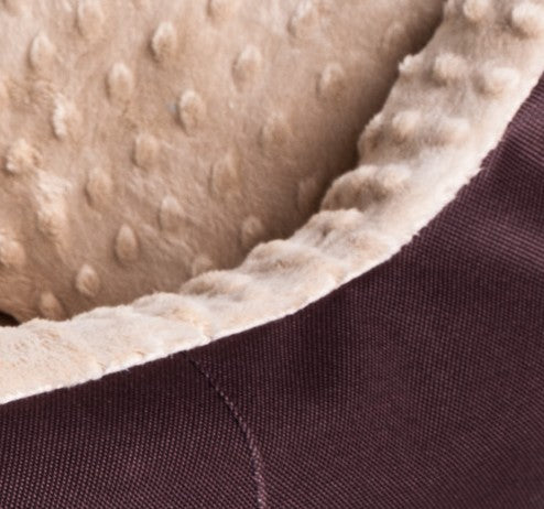 Pokrowiec do legowiska wykonany z zewnątrz z kodury - materiału bardzo wytrzymałego, a także odpornego na uszkodzenia. Wnętrze jest wykonane z materiału typu minky (w kropeczki) - bardzo przytulny i miękki.