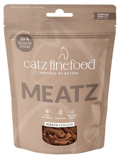 Catz Finefood Meatz N.09 to chrupiące paski z 99% grillowanego i suszonego mięsa jelenia.