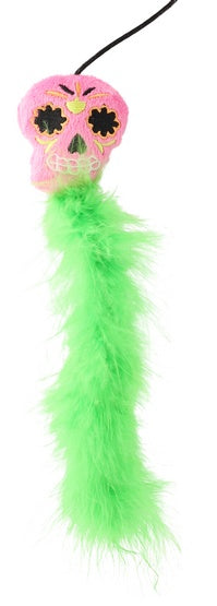 Z wędki na sznurku zwisa prawdziwy Upiorek! Jest wypełniony bezpiecznym materiałem, a sam jest strrrrasznie miękki i przyjemny w dotyku. Dzięki puchatym, zielonym piórom Upiorek zachęci do zabawy nawet najstraszniejszego kociego lenia.