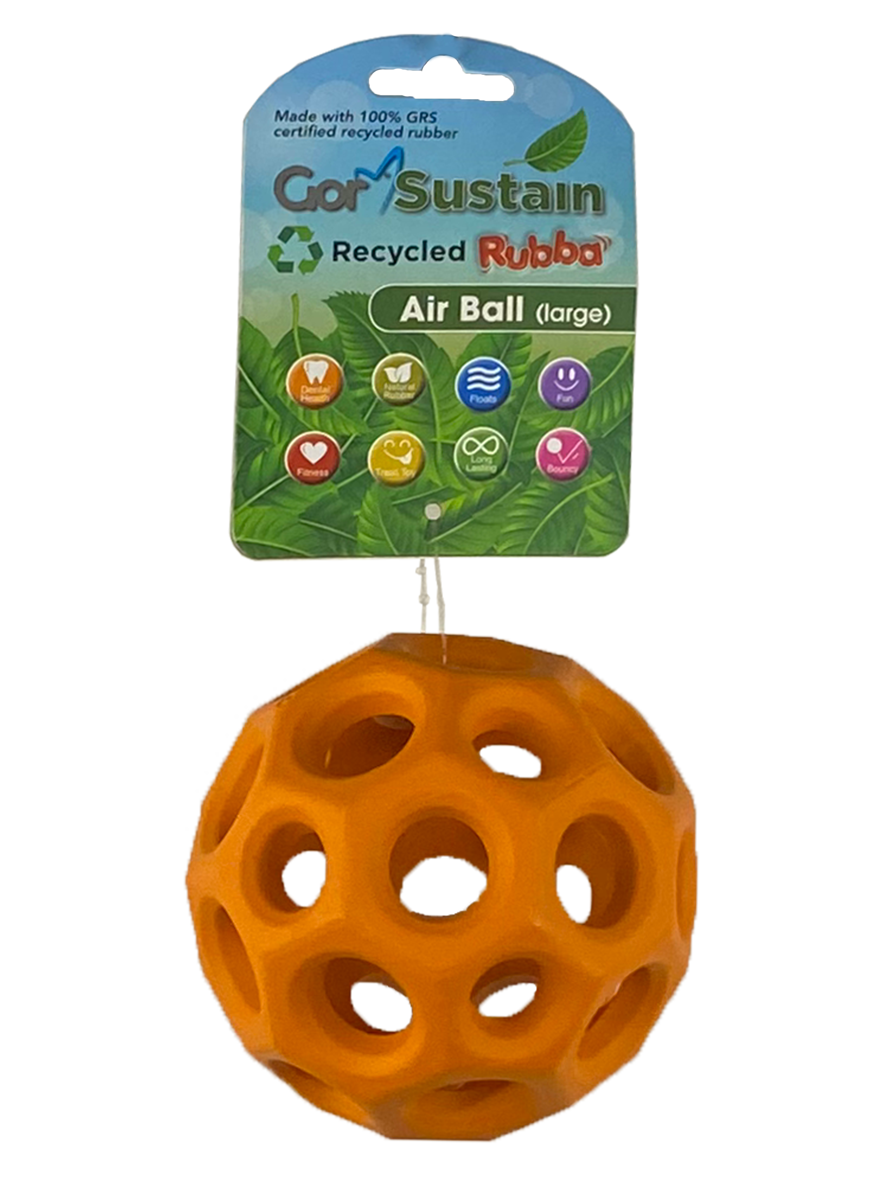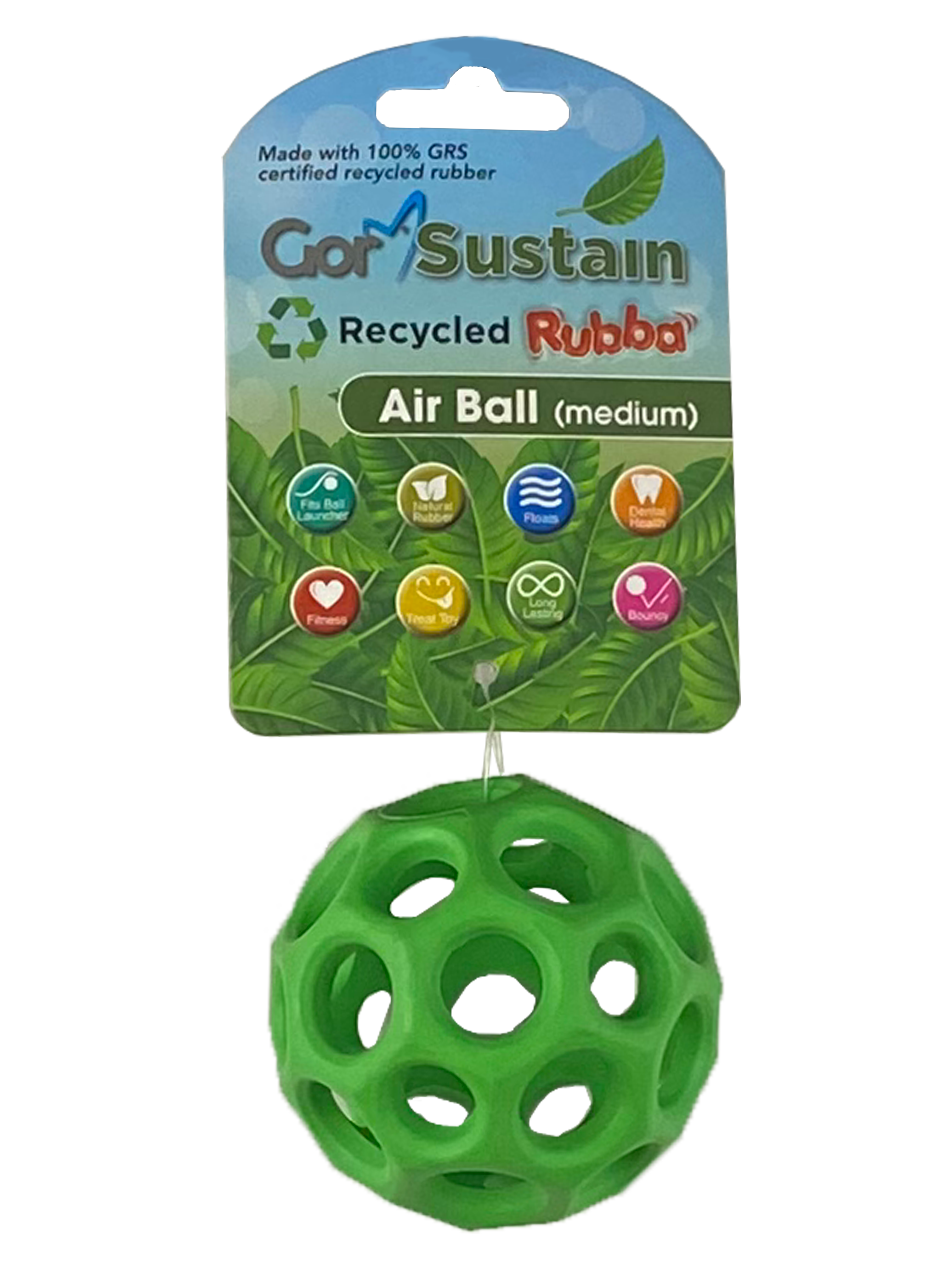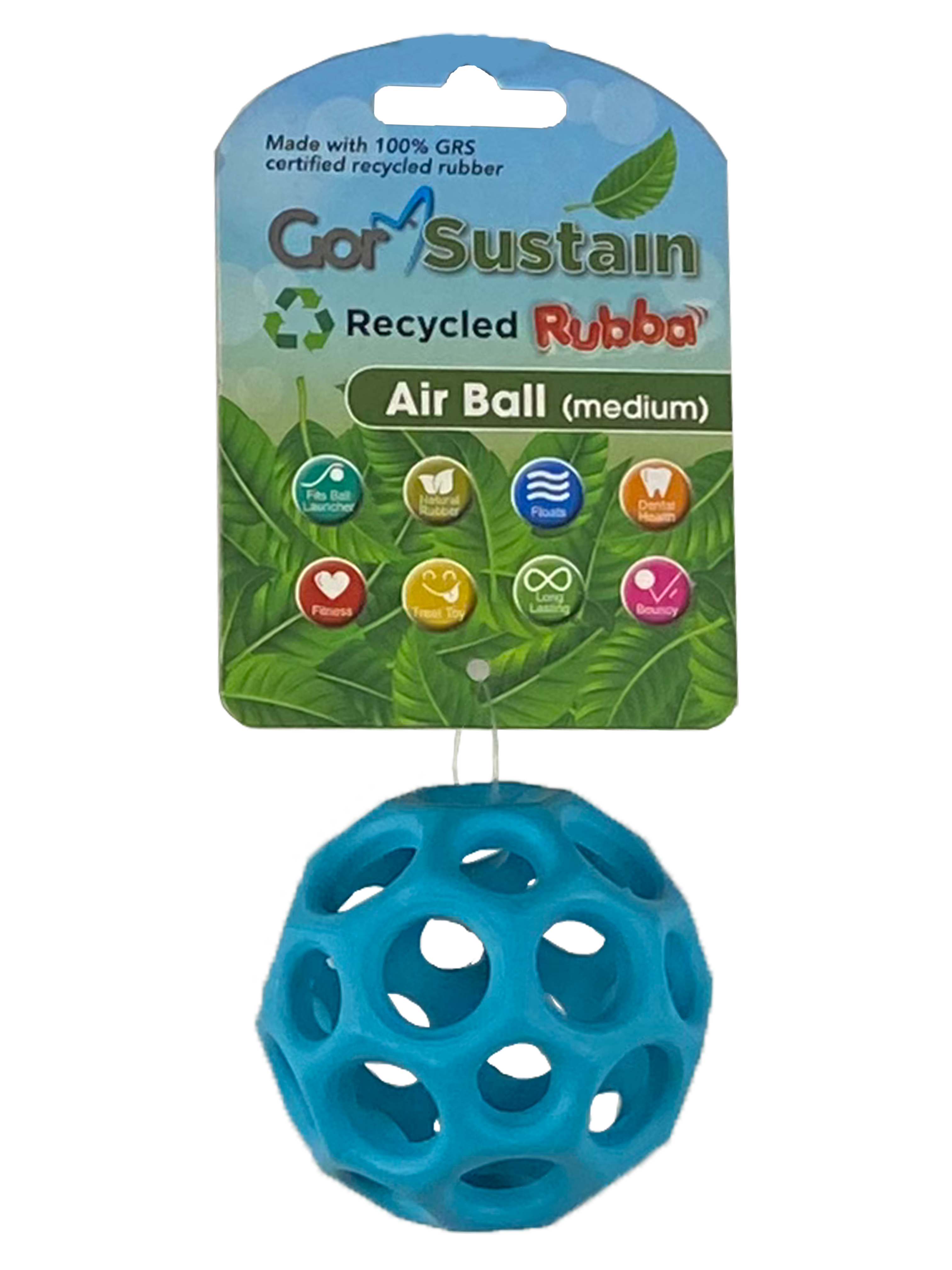 The Gor Sustain Air Ball is the perfect choice for lightweight and bouncy play, combining sustainability with entertainment. Made from 100% GRS-certified recycled rubber, this durable ball is designed for active dogs who love to chase and retrieve.Crafted for interactive outdoor fun, the Air Ball offers exceptional bounce and durability, ensuring endless excitement for you and your pet. Available in vibrant colors, it’s a fun, eco-conscious addition to your dog’s toy collection.Key Features:• Eco-Friendly Material: Made from 100% GRS-certified recycled rubber, promoting sustainability.• Bouncy Design: Ideal for lightweight and energetic outdoor play.• Durable Construction: Built to withstand vigorous play and regular use.• Vibrant Variety: Available in three bold colors to suit your style and your dog’s personality.• Versatile Play: Perfect for fetch games in parks, gardens, or any outdoor setting.