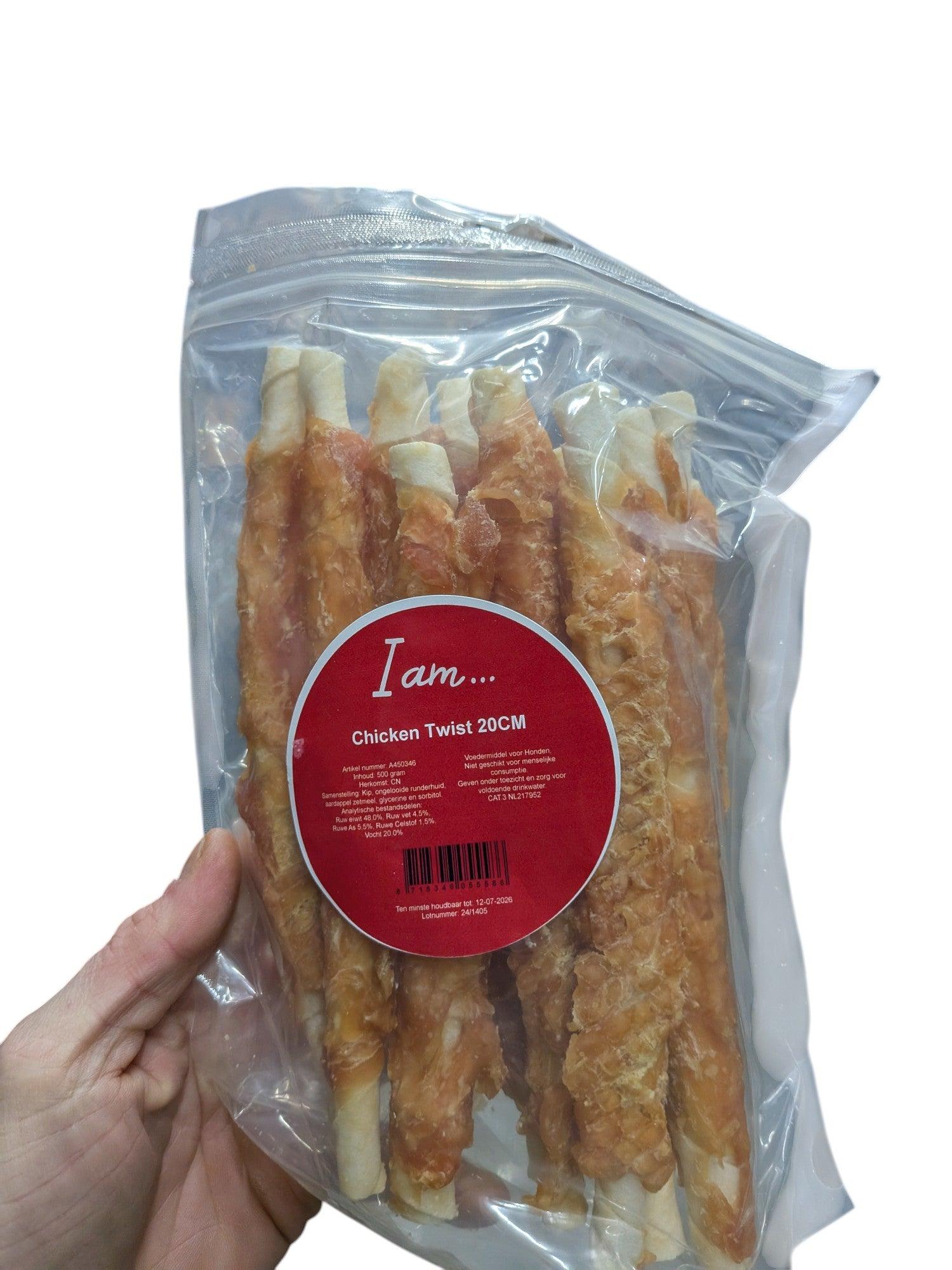De I Am Chicken Twist van 13 cm in 400 gr is een lekkere kauwsnack voor jouw hond van kipfilet en runderhuid. Een heerlijke snack voor de hond! Door op deze snack te kluiven help jij de tanden van jouw hond te verzorgen en verveling tegen te gaan. De runderhuid wordt langzaam zachter en helpt tandplak te verminderen door het wrijven langs de tanden. Door de toevoeging van kipfilet is de Chicken Twist nog aantrekkelijker voor jouw hond.