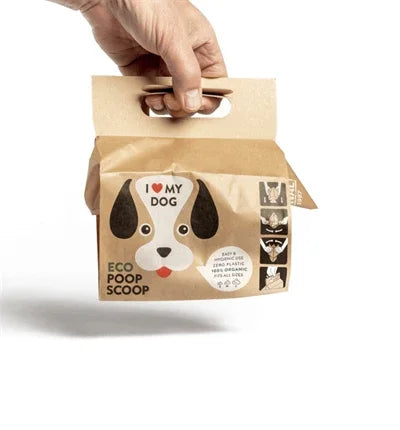 The I Love My Dog Dog Poop Bag Bundle (10 pieces) is a handy and environmentally friendly poop bag with a simple scooping system. With this handy bag, you can clean up your dog's poop in a flash! The scooping action makes cleaning up poop not only easy, but also very hygienic, as there is no direct contact with the waste. The bags are environmentally friendly, made from recycled paper and cardboard, and 100% biodegradable. To top it all off, these bags are suitable for all types of dog poop; even runny poop and very large droppings.