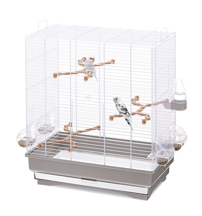 The Imac Carlotta Birdcage Taupe/White 50 x 30 x 56 cm is a practical birdcage with perches, food and water bowls, and a sliding drawer, suitable for small birds such as canaries, tropical birds, and budgies. This sturdy cage is finished in a modern color scheme of taupe and white, with white bars. The bars on the front and back are horizontal, allowing the birds to climb. The cage is easy to clean thanks to the sliding drawer in the bottom tray, which ensures that the tray can be easily cleaned without the birds being able to escape. If you still want access to the birds, this can be done through the doors on the front and side. The cage comes with three organically shaped perches, four food bowls, and a water fountain.