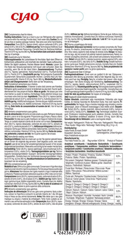 Analytical constituents: Crude protein (min) 7%, crude fat (min) 0.8%, crude fiber (max) 0.3%, moisture (max) 88%, DHA (min) 0.04%, EPA (min) 0.04%, Calcium (min) 0.3%, Vitamin E (min) 310 IU/kg, taurine (min) 0.025%