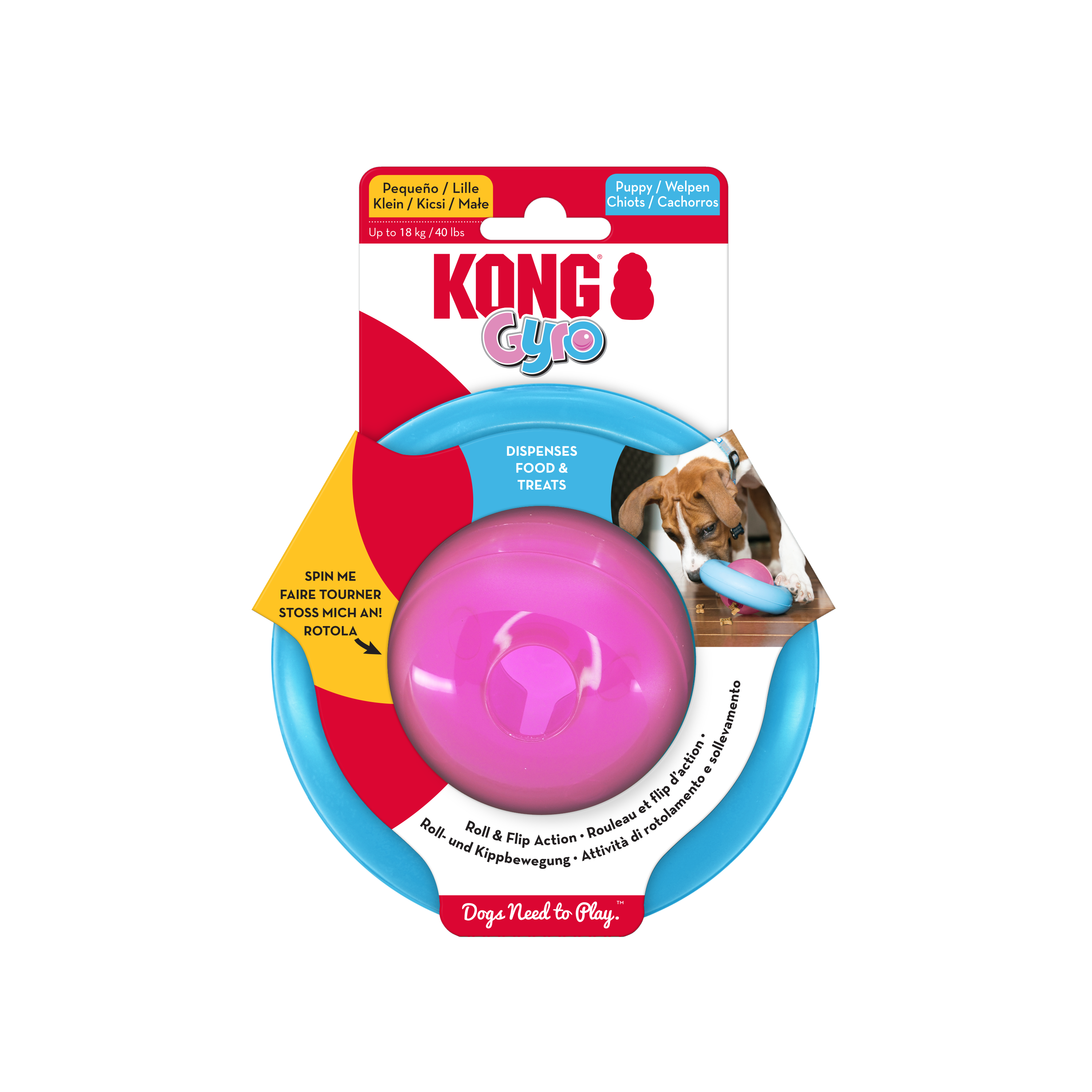 The KONG Gyro is sure to entertain with irresistible roll and flip action keeping dogs enticed and intrigued. With the center spinning orb and static outer ring, this dynamic toy encourages dogs to push, paw and roll the GYRO, delightfully dispensing tasty treat rewards along the way. Ideal for independent play, stuff with snacks or kibble for added fun and extended playtime. Available in large and small sizes.