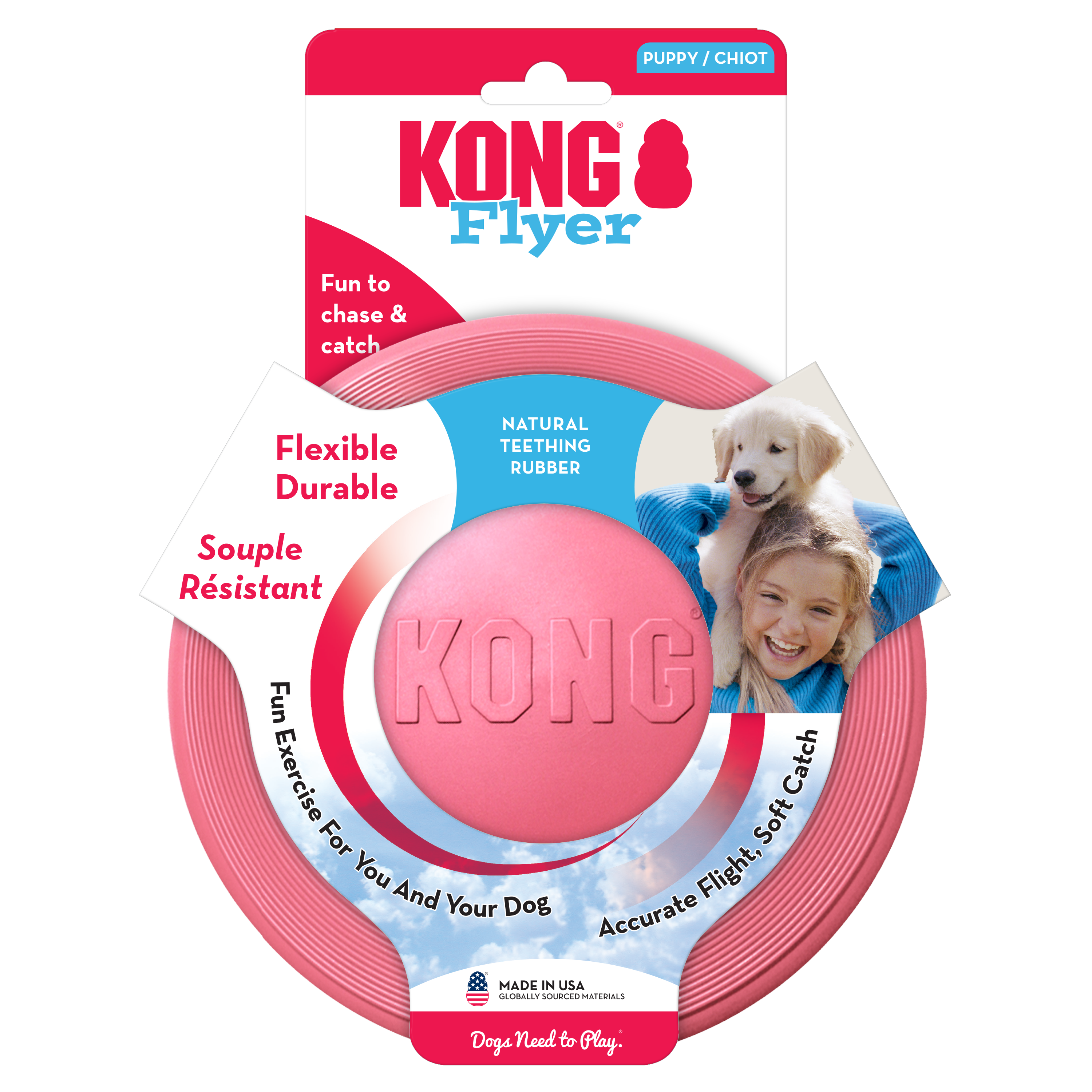The KONG Puppy Flyer is for puppies that are learning how to play fetch. Made from the KONG Classic unique puppy rubber, this flyer helps make for a softer catch. Sized especially for puppies, KONG Puppy Flyer is ideal for pups up to 9 months of age when they can graduate to KONG Classic Flyer. Let your puppy’s love of fetch take flight with a safer disc that delivers healthy activity.