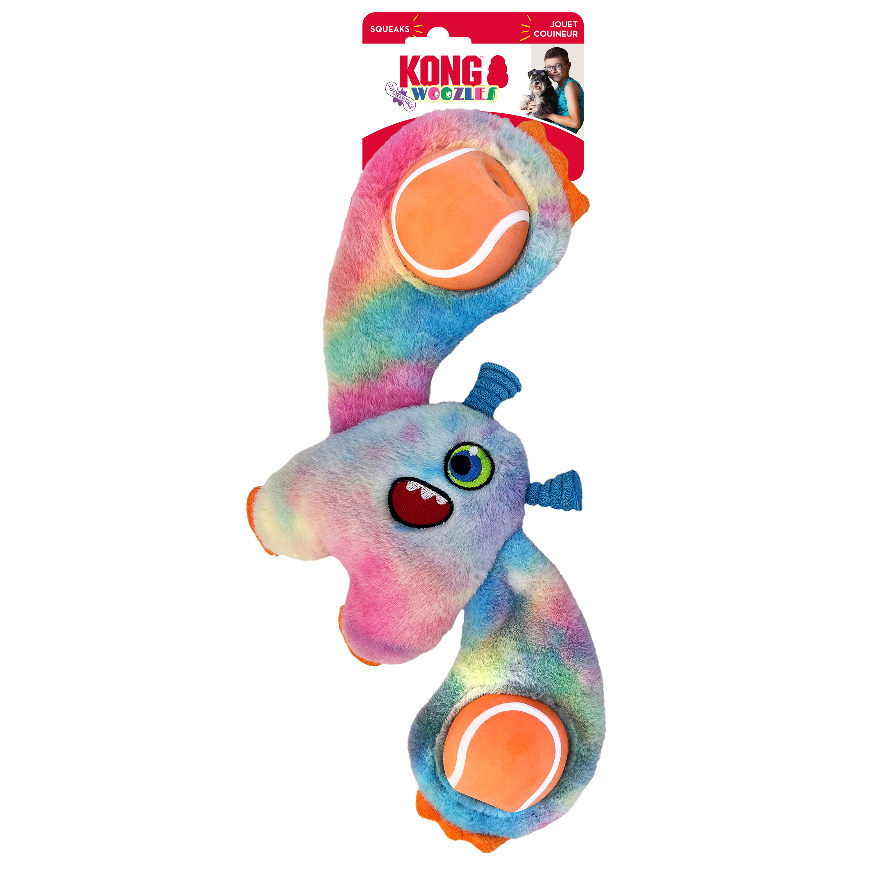 KONG Woozles Monsters’ half-ball arms make flopping and shaking even more fun, satisfying natural instincts. This silly cyclops has a squeaker in each ball section, keeping the action going with a creature whose dense, soft fur invites snuggles between celebrations of tugging, tossing and thrashing.