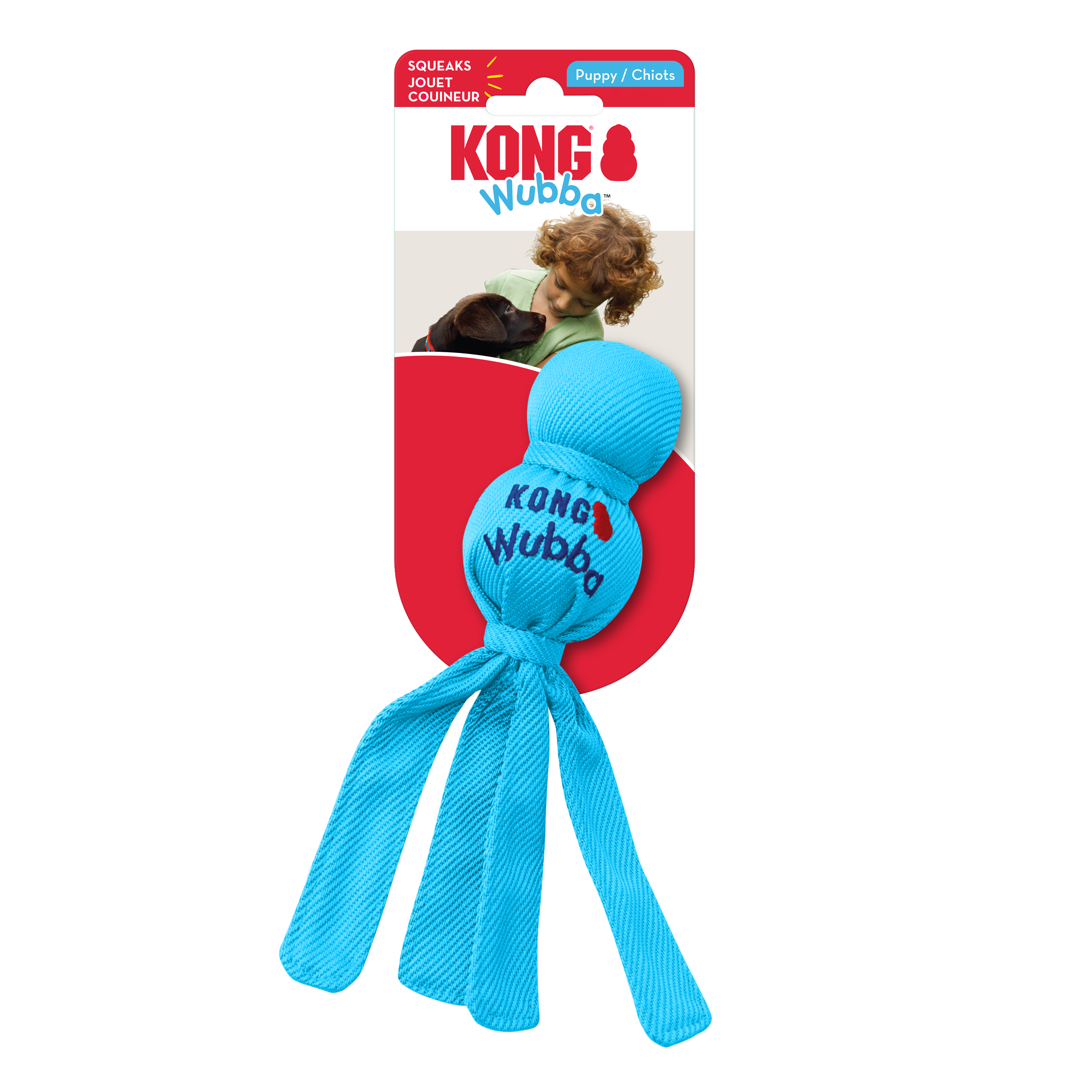 PUPPY WUBBA is perfectly sized for puppies. It is a fun interactive toss and tug toy. Durable reinforced nylon fabric covers two balls - a tennis ball on top and a squeaker ball beneath. The long tails make it easy to pick up and throw. Dogs love to squeak the WUBBA and shake the flapping tails back and forth.