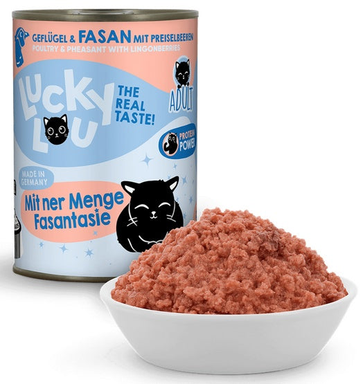 Gdzie indziej jest nudne standardowe jedzenie - Lucky Lou jest dostępne w 18 różnych odmianach smakowych w saszetkach 125 g oraz w puszkach 200 g i 400 g. Karma produkowana w Niemczech.
