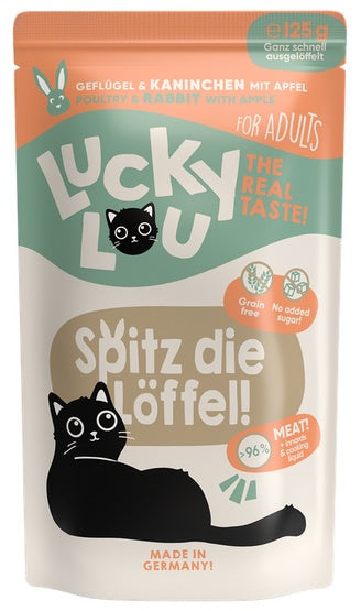 Gdzie indziej jest nudne standardowe jedzenie - Lucky Lou jest dostępne w 18 różnych odmianach smakowych w saszetkach 125 g oraz w puszkach 200 g i 400 g. Karma produkowana w Niemczech.