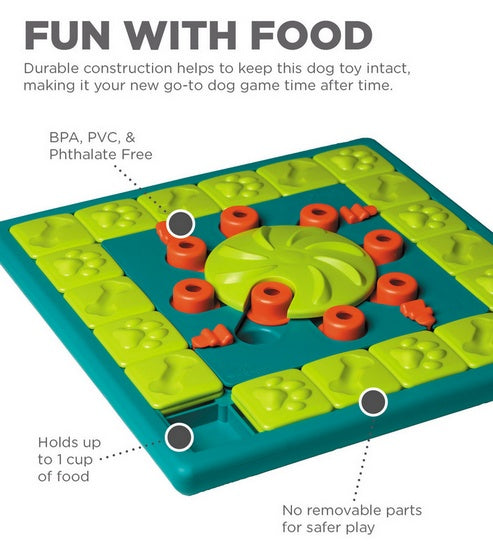 Węsząc i pomagając sobie łapą lub pyszczkiem pies natrafi na przegródki, które będzie musiał odblokować, zanim sięgnie po ukryte w nich łakocie. System blokady polega na przesuwaniu ruchomych płytek  znajdujących się na brzegach zabawki. Dodatkowo na środku jest obrotowe pokrętło z wnęką pasującą do okrągłych elementów również skrywających łakocie. Sprawdź czy Twój czworonóg jest geniuszem nad geniusze!