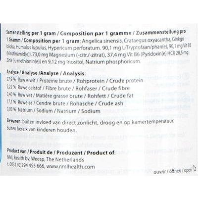 Composition: per 1 gram, Dong Quai, Hop (Humulus lupulus), Ginkgo biloba, Hawthorn (Crataegus oxyacantha), St. John's Wort (Hypericum perforatum), 90.1 mg L-Tryptophan, 90.1 mg Vitamin B3 (nicotinamide), 73.0 mg Magnesium (as citrate), 37.4 mg Vitamin B6 (as pyridoxine HCl), 28.5 mg Zinc (as L-methionine) and 9.12 mg Inositol. A dilution of Natrium phosphoricum.