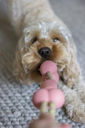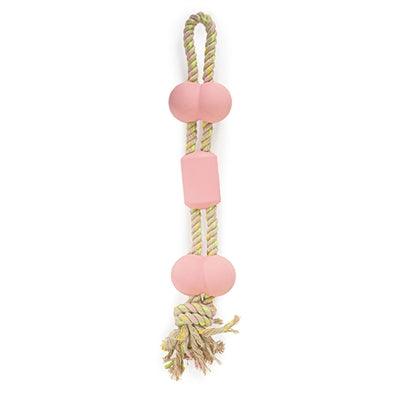 Het gedraaide touw maakt het ideaal voor touwtrekken en andere interactieve spellen, terwijl de rubberen blokjes het spelen nog leuker maken. De pastelkleurige tint zorgt voor een mooie look, en de barbecue smaak zorgt ervoor dat het speeltje extra lang interessant blijft.