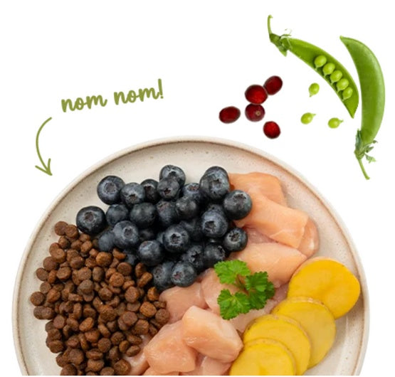 świeże mięso z kurczaka (25%), mąka ziemniaczana (17,5%), skrobia ziemniaczana, białko drobiowe (suszone), skwarki (suszone), białko ziemniaczane, tłuszcz zwierzęcy, siemię lniane, hydrolizat białka, suszony miąższ buraczany (bez cukru), mączka wątrobowa, włókno grochu, groch (suszony, 0,5%), olej z łososia (0,5%), węglan wapnia, borówki brusznice (suszone, 0,1%), borówki (suszone, 0,1%), pietruszka (suszona, 0,1%), drożdże (suszone, 0,1%), kwiaty nagietka (suszone, 0,05%)