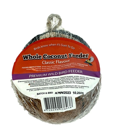 The Suet To Go Whole Coconut is a delicious winter food for garden birds, rich in fat for extra energy in a natural coconut shell. Birds in the garden or on the balcony could use some extra help in winter, and they will gladly come to your garden or balcony for this fun, filled coconut. The coconut is natural and filled with fat to give the birds much-needed extra energy. The coconut is easy to hang using the attached string.