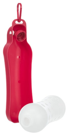 W czasie podróży również należy zapewnić psu dostęp do świeżej wody. Bidon z miską idealnie się do tego celu nadaje, gdyż pozwala na wygodny transport i podawanie wody. Doskonały na spacery i dłuższe podróże - może być transportowany na dwa sposoby: haczyk i odpinany pasek na ramię.