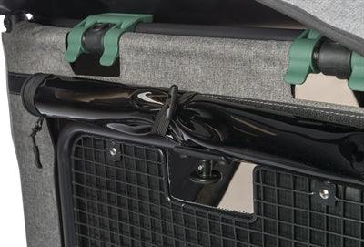 Binnenin de cabine zit een stevige veiligheidsriem met karabijnhaak waarmee je jouw hond aan zijn tuigje vastzet. Zo voorkom je dat je hond onverwachts opspringt of uit de kar probeert te springen. De combinatie van de veilige bevestiging aan de fiets en de interne vastzetmogelijkheid maakt deze fietskar een veilige keuze voor vrijwel elke situatie.