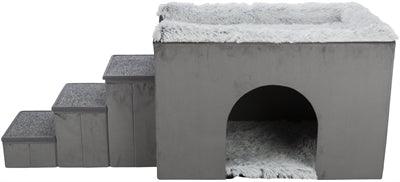 De bijgeleverde trap zorgt ervoor dat dieren moeiteloos het ligplateau bereiken. De treden zijn afneembaar, waardoor het huisje eenvoudig is aan te passen aan verschillende situaties en ruimtes. Dankzij het moderne design in grijze en witte tinten past dit hondenhuis goed in vrijwel ieder interieur. De schuimrubberen kussens en pluche bekleding zijn afneembaar en wasbaar op veertig graden, wat zorgt voor een hygiënische rustplek.