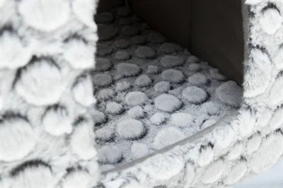 The Trixie Iglo Mila Cat Bed, Plush White/Grey, 32x32x42 cm, is an original hideaway for cats or small dogs; a shape-retaining house covered in soft plush and equipped with a cushion.