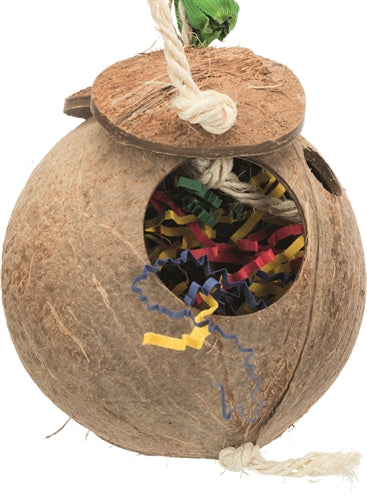 A super fun bird toy made from coconut, maize leaf, willow twig and sisal. The toy is filled with paper scraps and can be easily refilled with snacks, for example, thanks to the two openings.