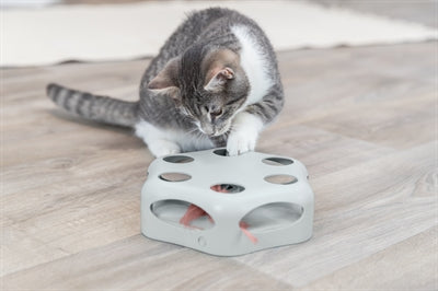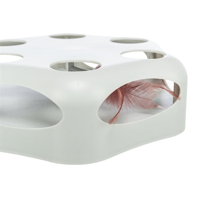 The Trixie Turning Feather Assorti is an interactive toy for curious cats. The feather in the middle moves unpredictably back and forth, occasionally stopping and randomly changing direction – perfect for stimulating your cat's hunting instinct. The toy can be filled with small reward treats for extra motivation. Thanks to the rubber feet, it stays stable during playtime. It automatically switches off after about 15 minutes. Requires 3 AA batteries (not included).