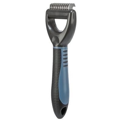 De kam is voorzien van een vertanding met een lengte van 1 cm, ideaal voor het gladmaken van zowel het dekhaar als de vervilte onderwol. De combinatie van het kunststof handvat met een rubberen coating en het metalen kamgedeelte zorgt voor een stevige grip en een lange levensduur.