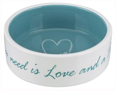 Fill this food bowl with food and your pet will eagerly eat it all up. The food bowl is inscribed with the words "All you need is Love and a pet" in petrol-blue lettering.