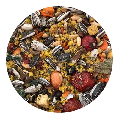 Ingredients: Seeds, grains, fruits (min. 6% of which 15% banana, 15% papaya, 15% pineapple), vegetable by-products, herbs, eggs and egg products, vegetables, vegetable protein extracts, minerals 2%, diatomaceous earth, sugar, oils and fats, yeast, thyme powder, nettle and seaweed.