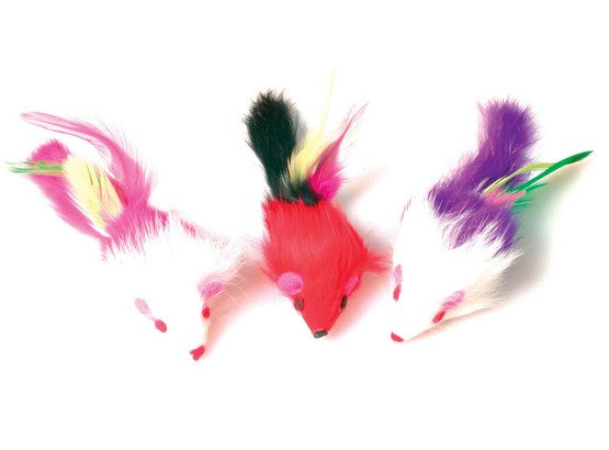 Zabawka dla kota - zestaw trzech kolorowych myszek z piórami.