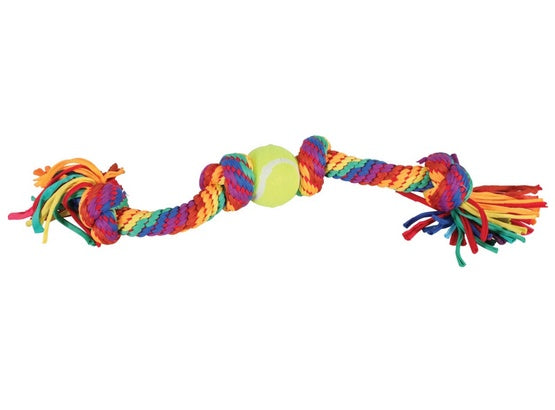 Zabawka szarpak sznur z piłką tenisową RAINBOW to innowacyjny produkt z nowej gamy zabawek ZOLUX. Wykonana ze sznurka zabawka z piłką tenisową łączy funkcję szarpaka z korzyściami zdrowotnymi dla jamy ustnej psa.
